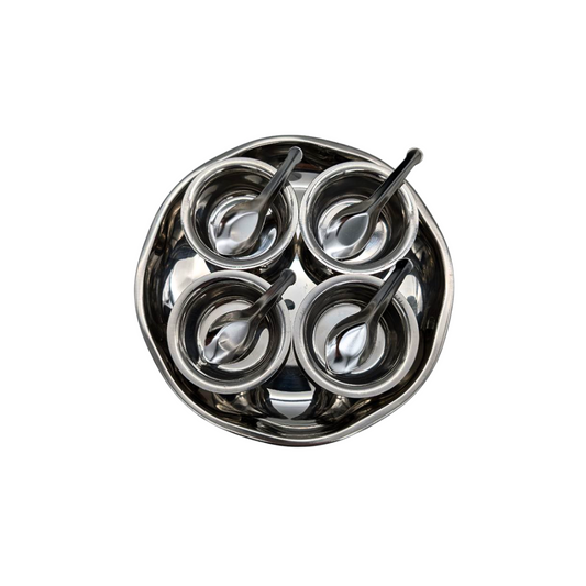 Stainless Steel Relish Dishes Set - Includes 4 Bowls, 4 Spoons, and 1 Wavy Edge Plate (Set of 9)