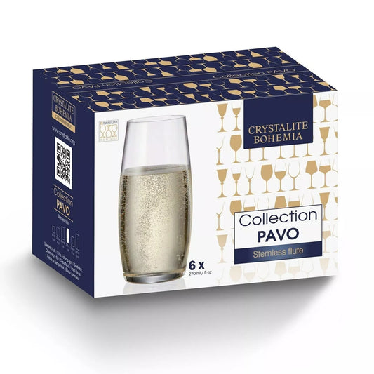 Crystalite Bohemia Stemless Champagne Flute Glasses – Set of 6, 270ml