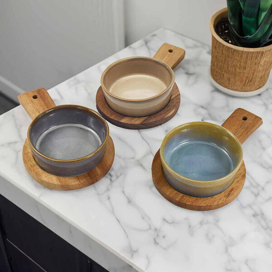 Wooden Base Serving Dish with 4 Copper and Stainless Steel Bowls