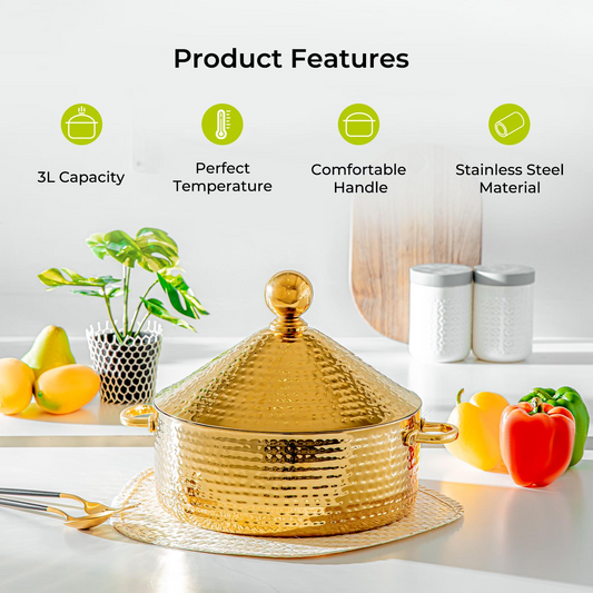 Royalford 3L Stainless Steel Serving Dish and Food Warmer/Hot Pot with Cornetto Gold Finish