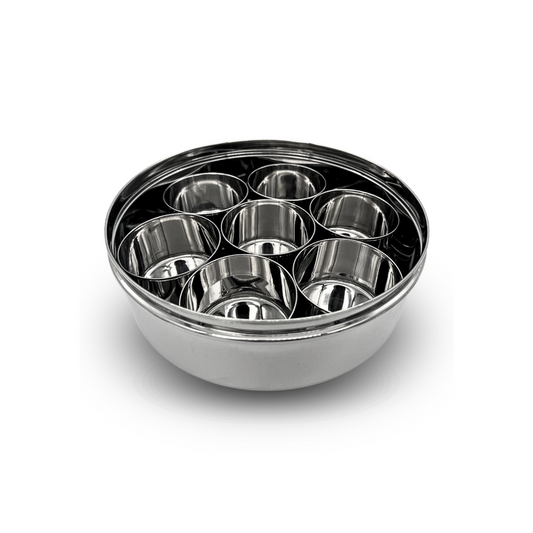 Stainless Steel Masala Dabba with 7 bowls for spices with see through lid 24cm