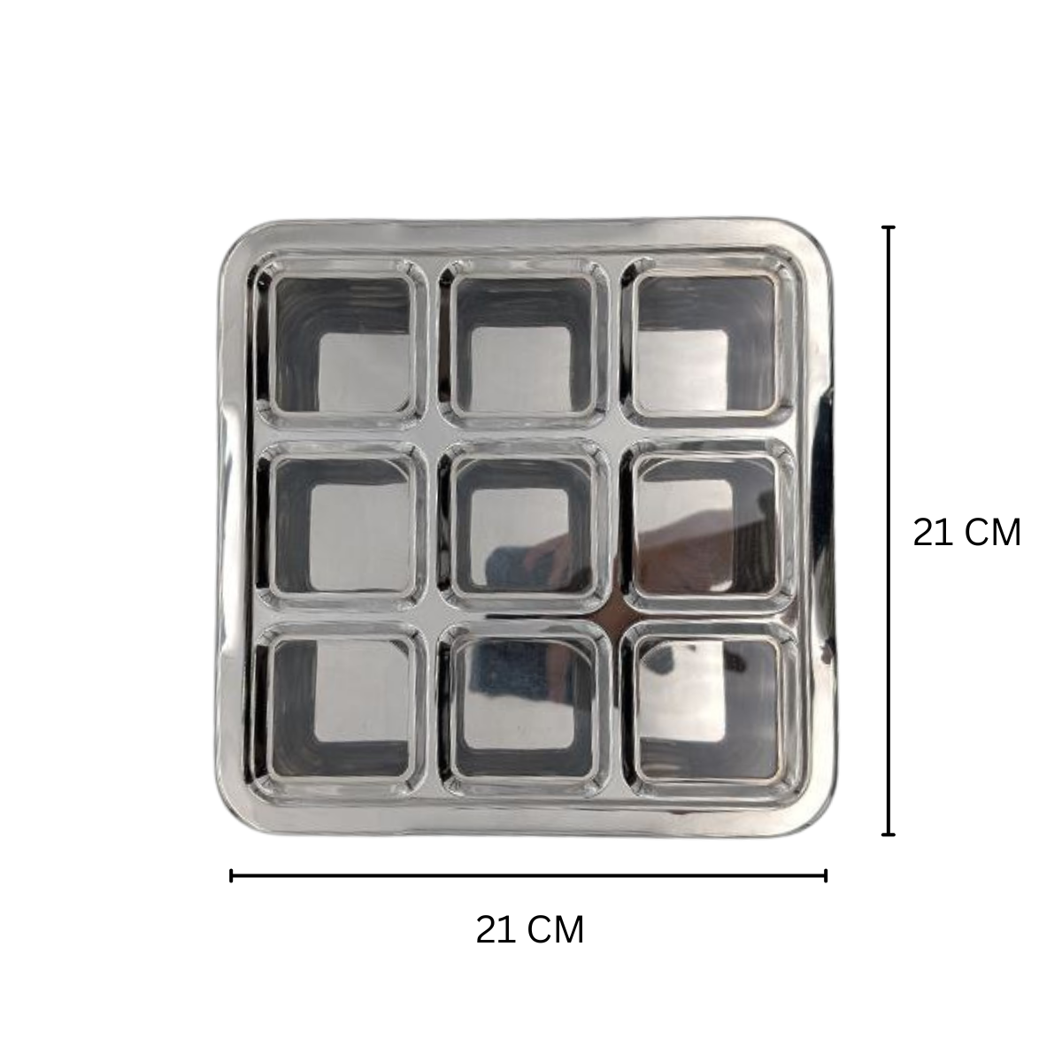 Organise and store your essential spices effortlessly with this stainless steel Masala Dabba, designed for convenience and elegance. This square-shaped spice box features 9 individual compartments, allowing you to neatly arrange various spices, herbs, and condiments for easy access.