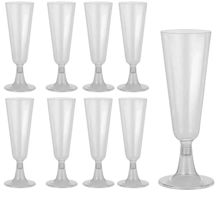 Raise a toast to style and convenience with this set of eight 140ml reusable plastic champagne flutes. Perfect for weddings, parties, and celebrations, these flutes are designed to bring elegance to your event while offering the practicality of shatter-resistant and lightweight drinkware. Crafted from high-quality, food-safe plastic, they deliver the sophistication of traditional glass without the risk of breakage, making them ideal for both indoor and outdoor occasions.