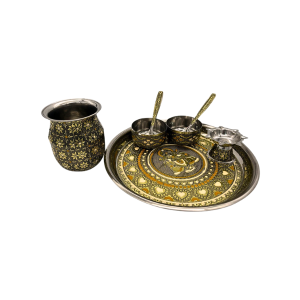 - Complete Set: Includes a 10-inch thali, Kalash, two bowls, two spoons, and a Diya/Dhoop stand.